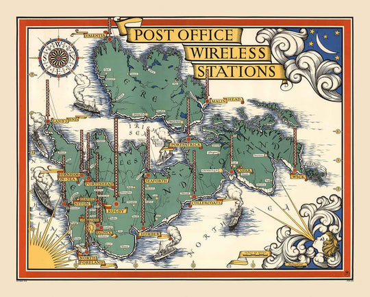 Esta maravillosa antigua mapa de las Estaciones Inalámbricas de la Oficina General de Correos de las Islas Británicas fue publicada originalmente en 1939. Fue creada por Macdonald Gill.