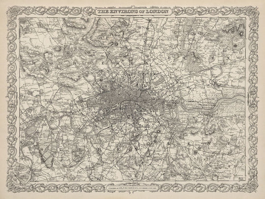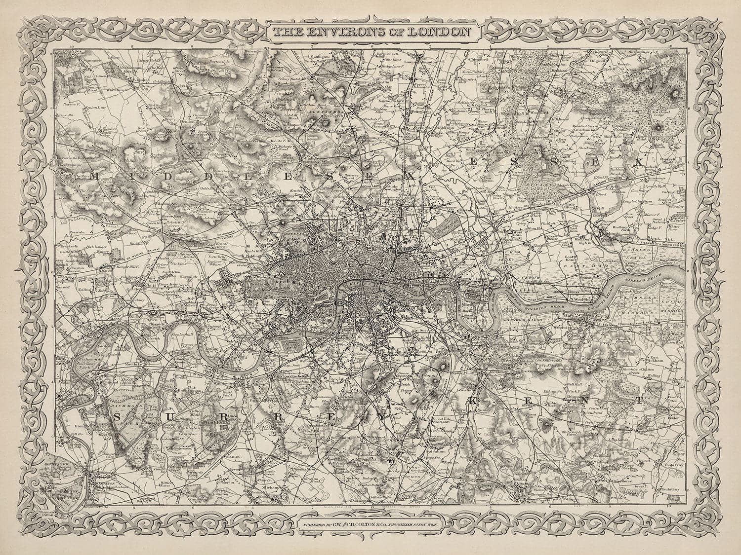 Los alrededores de Londres por G.W. Colton en 1886 muestran cuán grande se había vuelto Londres en el apogeo del Imperio Británico. La mayor parte de lo que ahora consideramos los distritos del centro de la ciudad ya está en su lugar, pero los suburbios siguen siendo campos y bosques.