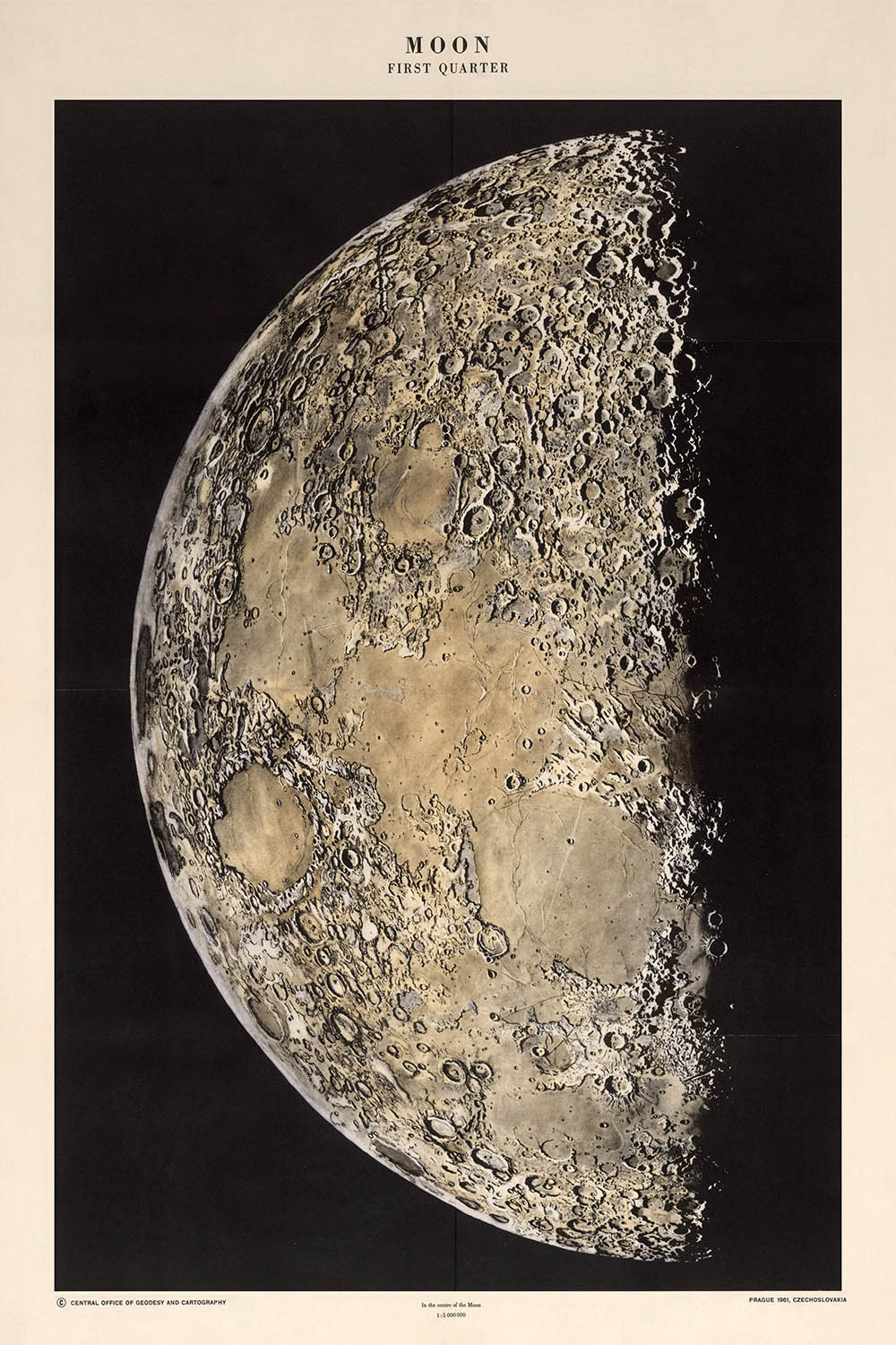 El "Primer Cuarto de la Luna", originalmente titulado "Luna: Primer cuarto", es una notable litografía en color antigua creada por Josef Klepešťa en 1961. Esta obra de arte captura un mapa detallado de la luna durante su primer cuarto, destacando sus prominentes cráteres y montañas lunares, basado en fotografías tomadas en el Observatorio Lick en California y otros observatorios internacionales.