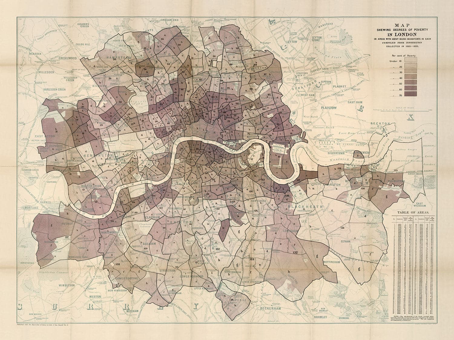 Superpuestos hay secciones coloreadas que muestran el porcentaje de personas que viven en pobreza en esa área. La sombra más clara muestra menos del 10% de personas viviendo en pobreza, hasta el rojo oscuro, que representa el 70% de personas en pobreza. (¡Los tiempos eran difíciles en el Londres victoriano!)