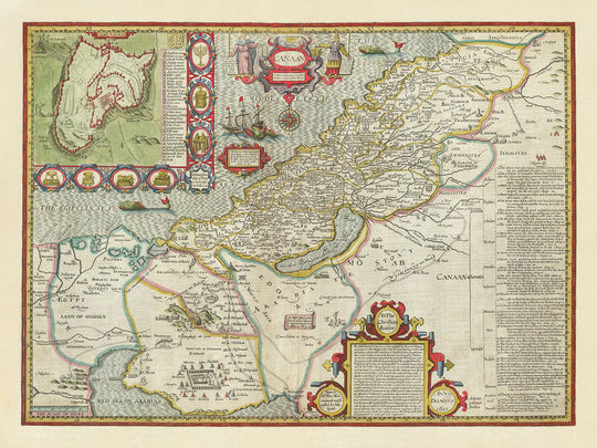 Este hermoso e histórico mapa de Canaán (Tierra Santa) fue creado por John Speed en 1611. Es un mapa muy detallado que muestra la región tal como se conocía en ese momento, incluidas las ubicaciones de las principales ciudades, ríos y montañas.