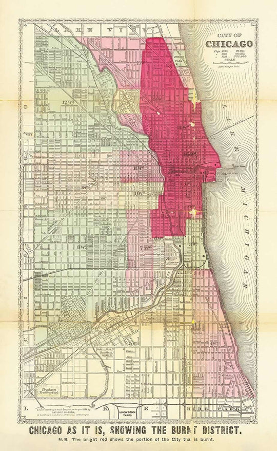 Un mapa fantástico, históricamente importante de Chicago, publicado en 1871 poco después del Gran Fuego, que se quemó durante 2 días y eliminó una gran parte de la ciudad.