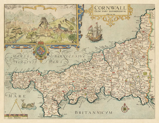 Muchos de los pueblos, aldeas y ciudades en Cornwall ya son visibles en este mapa. Curiosamente, un hermoso grabado en la parte superior izquierda de Launceston sugiere que esta ciudad era la capital de Cornwall en ese entonces. Cornwall en sí tiene una forma diferente también; ahora sabemos que la península suroeste está mucho más al sur.