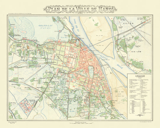 Al profundizar en el "Plan de la Ville de Hanoi", se descubre no sólo un mapa, sino una narrativa del desarrollo urbano bajo el dominio colonial francés. El mapa revela una Hanoi que está empezando a reflejar una ciudad europea, con amplias avenidas arboladas como Avenue Carnot y Boulevard Henri Rivière, y espacios públicos importantes que hablan de la ambición de la administración colonial de remodelar la ciudad. Lugares emblemáticos como la Ciudad Imperial, el Templo de la Literatura y la Ópera están meticulosamente señalizados, lo que ofrece información sobre el tejido cultural de Hanoi a principios del siglo XX. Este nivel de detalle se extiende a la representación de barrios desde el sereno Grand Lac (Tay Ho) hasta las bulliciosas calles de Hoan Kiem, lo que lo convierte en un rico recurso para comprender los diversos paisajes de la ciudad.