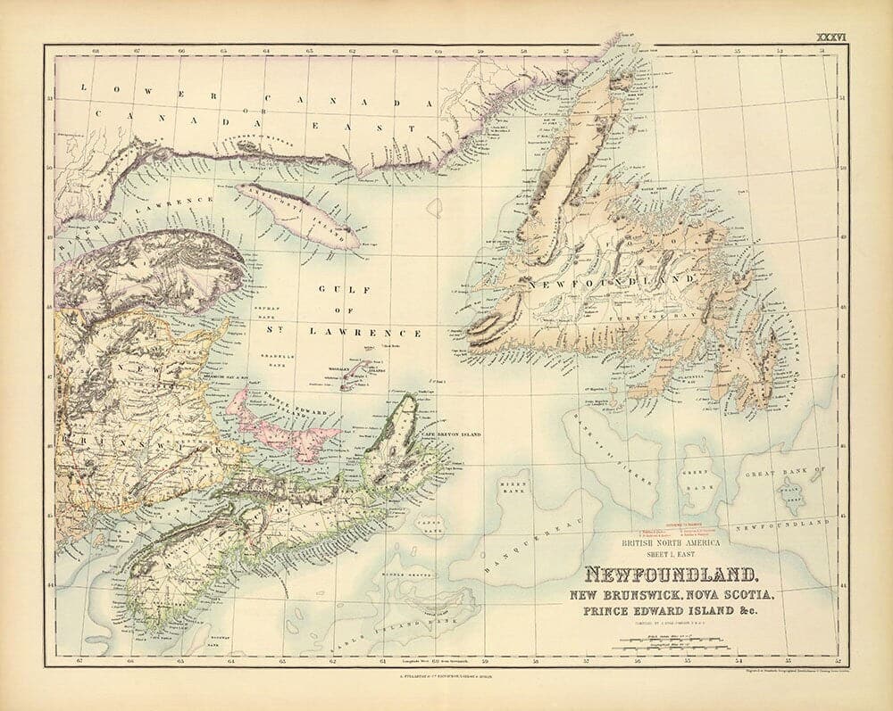 Antiguo mapa de Terranova, Nueva Escocia y Nuevo Brunswick, 1872 por Fullarton: Canadá, América del Norte Colonial Británica