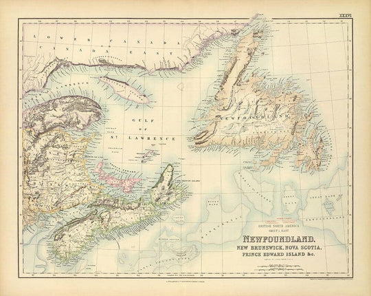 El mapa incluye Terranova, Nuevo Brunswick, Nueva Escocia, Isla del Príncipe Eduardo e Isla Anticosti. Las grandes ciudades y pueblos de estas provincias canadienses también son visibles, incluyendo St Johns, Halifax y Fredericton.