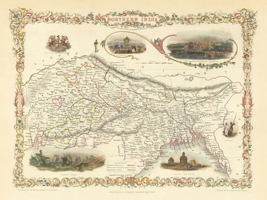 El mapa incluye numerosas ciudades y pueblos, como Delhi, Calcuta, Lucknow, Agra y Katmandú, cada uno con su propio significado histórico y cultural. Estos asentamientos están meticulosamente etiquetados y ofrecen una instantánea del paisaje urbano durante el Raj británico. El borde decorativo del mapa y los grabados artísticos lo convierten no sólo en un valioso documento histórico sino también en una hermosa obra de arte. Los coleccionistas y entusiastas apreciarán la capacidad del mapa para transportarlos al pasado, brindando una ventana a la compleja y fascinante historia del norte de la India.