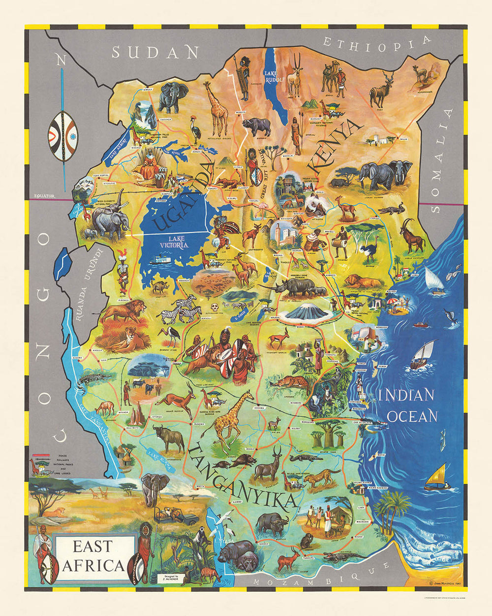 Antiguo mapa pictórico de África Oriental de McKenzie, 1961: Nairobi, Serengeti, Tsavo, Kilimanjaro, Victoria