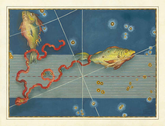 Este mapa estelar fue publicado originalmente en 1603 en "Uranometria" de Johann Bayer, quizás el atlas estelar más influyente jamás publicado y el precursor de todos los atlas estelares modernos. Contenía 51 mapas estelares altamente precisos, 48 de los cuales eran las constelaciones ptolomeicas. Y, por supuesto, los 12 signos principales del Zodiaco, incluyendo este encantador Piscis, estaban todos incluidos.