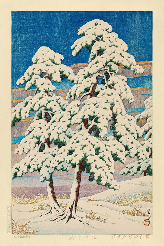 Los Pinos Después de la Nieve de Hasui Kawase es una exquisita impresión en madera creada por primera vez en 1935, un brillante testimonio del renombrado movimiento japonés shin-hanga. En japonés, la obra de arte se conoce como 松の雪晴れ (Matsu no Yukibare). Hasui Kawase, celebrado por sus interpretaciones poéticas del paisaje y la estación, captura aquí una tranquila escena invernal que evoca la calma elegancia de la nieve recién caída entre grandes pinos. Sus obras están profundamente arraigadas en la tradición artística japonesa, combinando efectos atmosféricos matizados con una sensibilidad a la belleza siempre cambiante de la naturaleza.