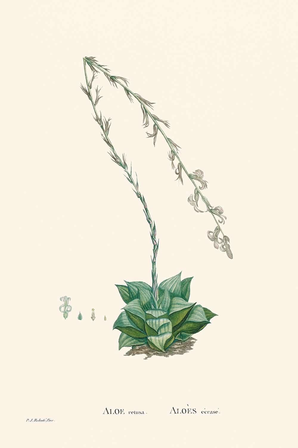 Cactus estrella (Aloe retusa), publicada por primera vez en 1802, es una impresionante ilustración botánica realizada por el prestigioso Pierre-Joseph Redouté. Conocido como uno de los mejores ilustradores botánicos, el legado perdurable de Redouté cobra vida en esta exquisita representación. Este artista nacido en Bélgica alcanzó un éxito temprano como tutor de pintura de María Antonieta y más tarde se hizo famoso por su prolífico trabajo a instancias de Josefina Bonaparte, la esposa de Napoleón. Su carrera estuvo marcada por una producción extraordinaria, pintando más de 2100 ilustraciones botánicas que incluían más de 1800 especies.