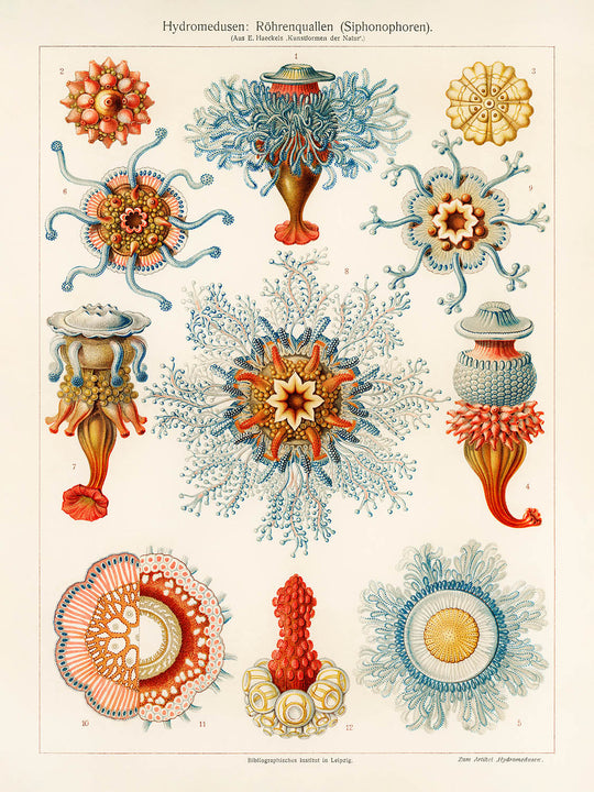 "Hydromedusen Rohrenquallen (Siphonophoren)" es una exquisita ilustración de la renombrada obra de Ernst Haeckel "Kunstformen der Natur" (Formas de Arte en la Naturaleza), publicada por primera vez en 1904. Esta obra de arte muestra una impresionante variedad de medusas, meticulosamente detalladas para capturar la elegancia y complejidad de estas etéreas criaturas marinas.