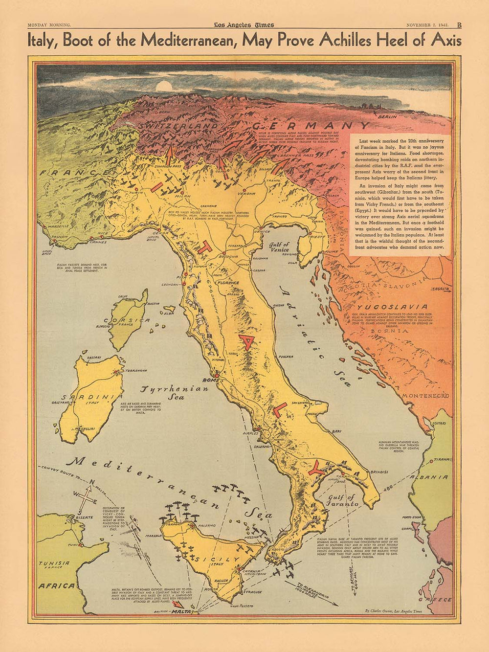 Step into the pivotal moments of World War II with this remarkable 1942 map, “Italy, boot of the Mediterranean, may prove Achilles Heel of Axis,” masterfully crafted by Charles Owens for the Los Angeles Times. This map is more than a geographical depiction—it is a vibrant, historically charged document that captures the tense atmosphere and strategic calculations of the era. Designed at a critical juncture in the war, it reflects Allied hopes and anxieties as they eyed Italy’s unique geography as a potential vulnerability in the Axis powers’ defenses.