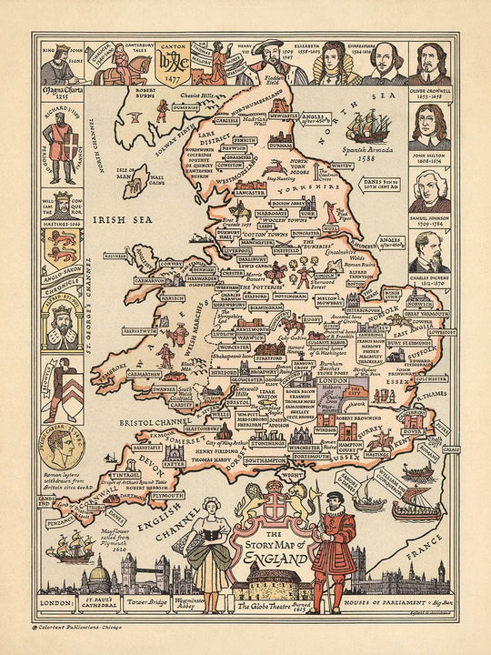 Los hitos de importancia histórica y cultural están prominentemente destacados, incluyendo Stonehenge, el Globe Theatre y las icónicas Casas del Parlamento. Estos sitios no son meros puntos en un mapa, sino que están intrincadamente ilustrados, capturando su esencia e importancia en la historia de Inglaterra. El mapa también celebra el patrimonio literario y político del país, con retratos de figuras influyentes como Shakespeare y Oliver Cromwell adornando sus bordes, proporcionando contexto y profundidad a la narrativa histórica.