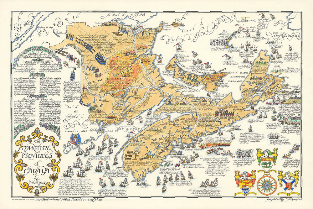 Mapa antiguo de New Brunswick, Nueva Escocia y la Isla del Príncipe Eduardo por Furse, 1963: Batallas navales, rutas de exploración