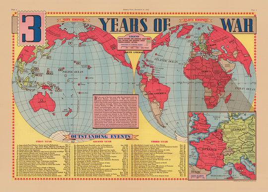 Antiguo mapa de la Segunda Guerra Mundial, 1945: "3 años de guerra" de Edwin Sundberg