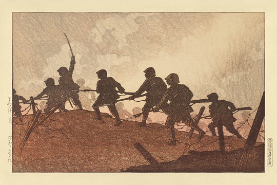 Soldier Assault es notable por su representación inquebrantable de movimiento y determinación—cualidades clave de la imaginería shin-hanga—en la que las figuras, vestidas con uniformes marrón oscuro y armamento beige, avanzan a través de un campo de batalla ambiguo. El sentido de unidad y acción inminente, amplificado por la maestría en el tallado y la impresión en madera, hace que la escena no solo sea una narrativa impactante, sino también un estudio atemporal en valentía y camaradería. La paleta de colores limitada ofrece una cálida sepia cautivadora, otorgando a la impresión una nostalgia melancólica así como una sofisticación contemporánea.