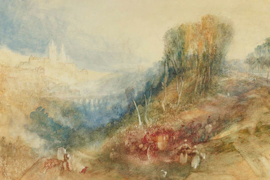 El notable uso del color y el estilo en esta obra de arte demuestra el enfoque visionario de Turner hacia la pintura, con el amarillo representando el cálido resplandor del sol, equilibrado delicadamente por los fríos azules del cielo y los audaces rojos que destacan sutilmente los elementos arquitectónicos dentro del paisaje. Poseer una impresión de esta obra maestra va más allá de un simple atractivo estético; ofrece un vistazo al genio de Turner y su impacto duradero en la evolución de la pintura de paisajes.
