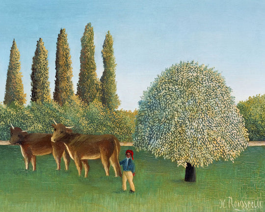 Henri Rousseau, a menudo referido como "Le Douanier" debido a su trabajo como recaudador de peajes, se esforzó por pintar mundos fantásticos muy alejados de su vida cotidiana. Sus obras fueron inicialmente malinterpretadas, pero más tarde ganaron reconocimiento y profunda apreciación por parte del mundo del arte. "Meadowland (El Pasto)" se erige como un testimonio de la capacidad de Rousseau para transportar a los espectadores a un mundo tranquilo e intacto, donde reina la armonía entre la exuberante flora y fauna.