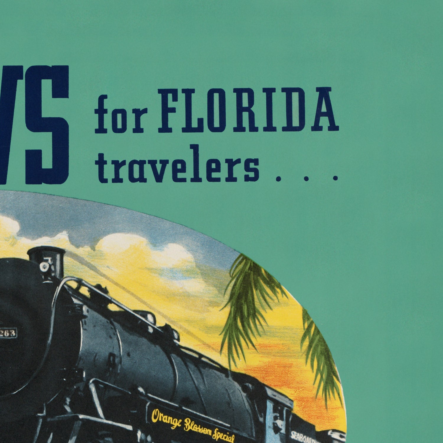 Why the subject matters: The Orange Blossom Special—introduced in the mid‑1920s—quickly became Florida’s most distinguished seasonal train. The poster text notes it had been “Famous for 11 years,” and trumpets a second train “matching the original in luxury, comfort and exceptional service.” This moment marked the height of rail‑to‑resort travel, when air‑conditioning, observation lounges, and streamlined service transformed long‑distance journeys to the Sunshine State.
