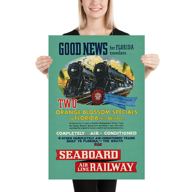 Good news for Florida travelers… Two Orange Blossom Specials to Florida this Winter! is a vintage railway travel poster published by the Seaboard Air Line Railway. Created during the golden age of winter tourism to Florida, it announces the expansion of Seaboard’s famed Orange Blossom Special service with twin trains racing south. The design centers on a dramatic oval vignette where two gleaming black steam locomotives charge past palm fronds at sunrise, a blue rosette ribbon proclaiming “The Blue Ribbon Trains to Florida,” all set against a sea‑green field with bold red and cream typography.