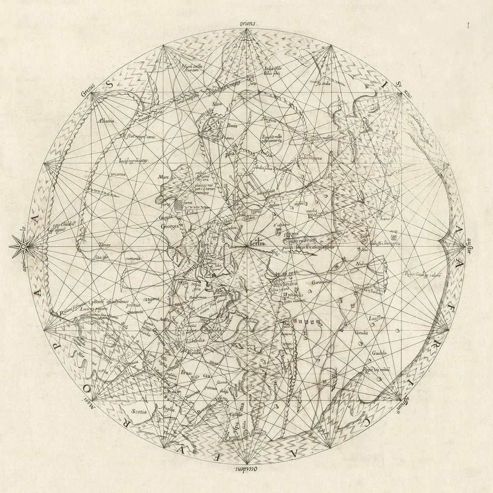 En términos de diseño, el mapa es una mezcla armoniosa de elementos medievales y modernos. El océano rodea las tierras conocidas, dejando las regiones exteriores a la conjetura, encarnando el espíritu aventurero de la época. La rosa de los vientos indica elegantemente las direcciones cardinales, guiando al espectador a través de un mundo donde el mito y la realidad se entrelazan. Este mappa mundi es una celebración de la curiosidad intelectual de la época, capturando la imaginación de exploradores y eruditos por igual.