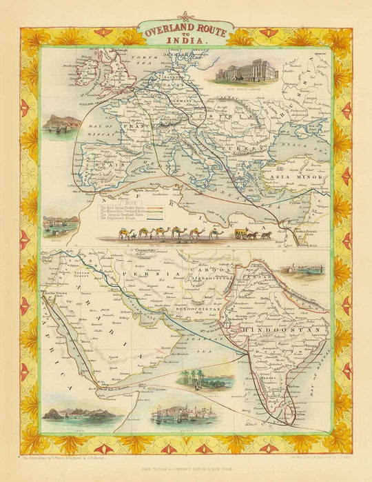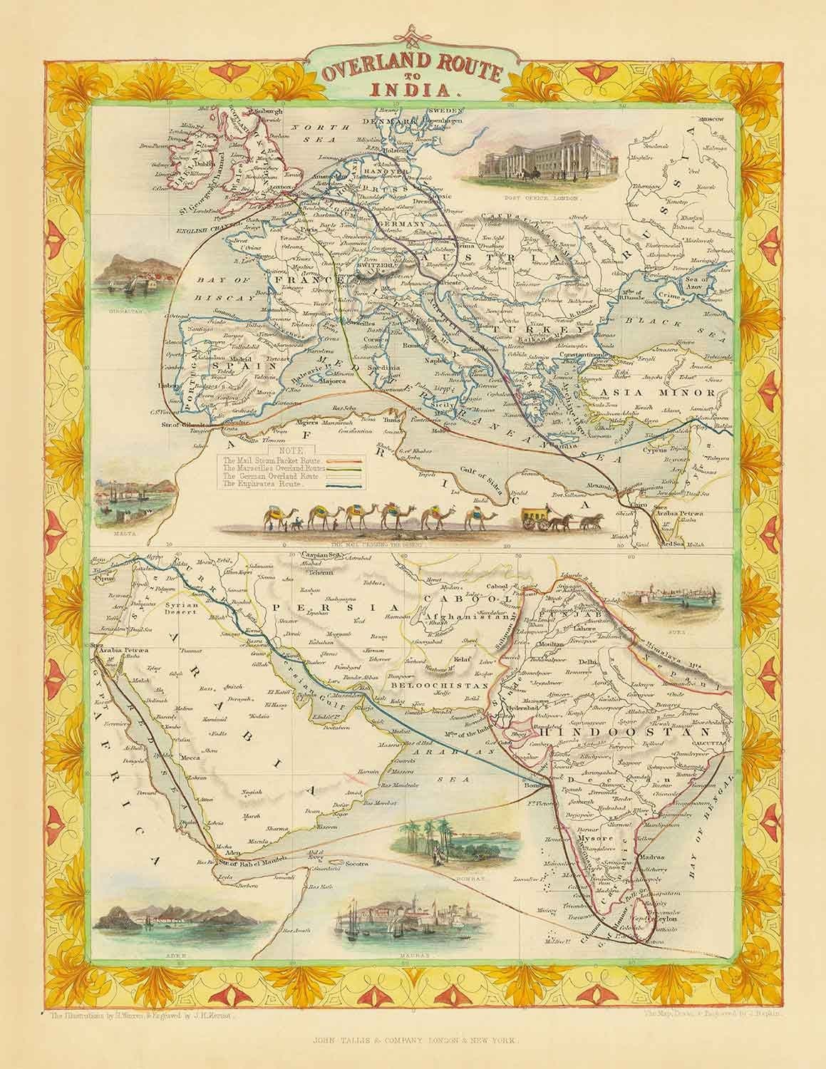 Grabado por John Rapkin y publicado por J. Tallis & Co en 1851, este es uno de los mapas históricos más finos y detallados de las rutas comerciales entre Europa e India en el apogeo de la Era Victoriana y el Imperio Británico.