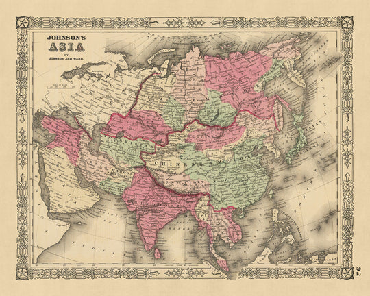 El diseño del mapa es una maravilla del arte cartográfico, presentando una litografía a color a mano que delimita vívidamente las fronteras políticas, ciudades, pueblos y características naturales como ríos y montañas. Empleando la proyección de Mercator, un método venerado por su capacidad para representar la Tierra esférica en una superficie plana con mínima distorsión, "Asia de Johnson" logra un notable equilibrio entre el atractivo estético y la precisión geográfica. El borde ornamentado, adornado con representaciones de la flora, fauna y monumentos culturales asiáticos, invita al espectador a apreciar la rica diversidad y profundidad histórica del continente.