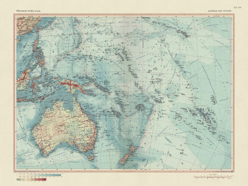 Sumérgete en los intrincados detalles del mapa de 'Australia y Oceanía', un impresionante testimonio de la destreza cartográfica del Servicio de Topografía del Ejército Polaco, que cobró vida por primera vez en 1967. Este Mapa Mundial, una representación política y física detallada, captura las vastas extensiones del Océano Pacífico y las masas de tierra que punctúan su azul inmensidad. Los temas del mapa se extienden más allá de la titular Australia y Oceanía, llegando hasta Hawái en el noreste, Polinesia en el sureste, Hong Kong en el noroeste y Borneo en el oeste. Esta cobertura expansiva proporciona una vista completa de la región del Pacífico, permitiendo al espectador apreciar la escala y diversidad de estas tierras distantes.