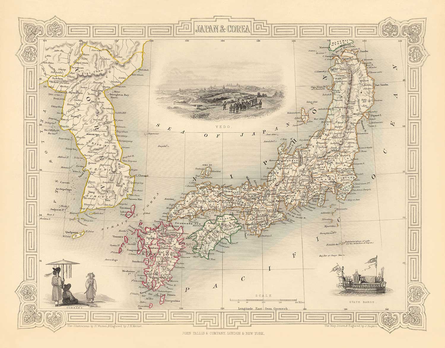 Mapa antiguo de Japón y Corea, 1851 por Tallis y Rapkin: Kyushu, Honshu, Shikoku, Hokkaido, Tokio, Seúl