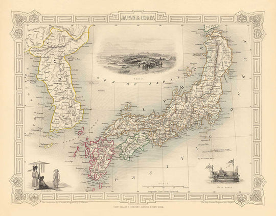En el mapa puedes ver algunas grabados detallados de lugares y paisajes interesantes de Corea y Japón. En la parte superior hay un boceto de Yedo (Tokio), y en la parte inferior izquierda algunos 'coreanos'.