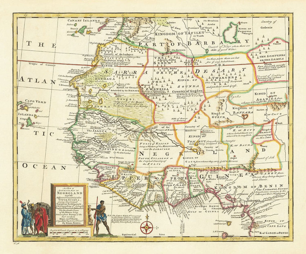 Pero en su mayor parte, este mapa muestra África Occidental cuando estaba gobernada por los grandes reinos independientes de Benin, Judá, Tafilet (ahora Marruecos y Argelia), Agades, Zanfara y Bito.