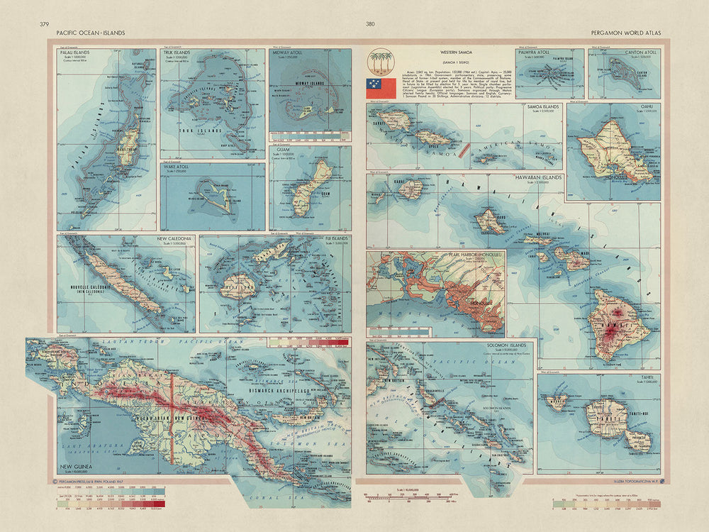 Mapa antiguo de las islas del océano Pacífico, 1967: Hawái, Fiyi, Palau, Nueva Guinea, Samoa, Pearl Harbour, atolones