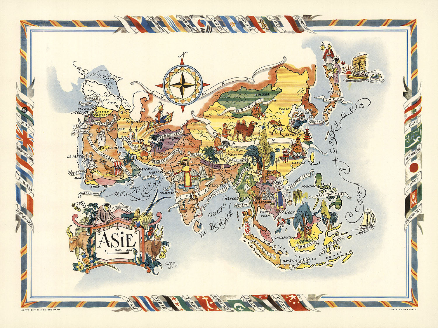 Antigua Mapa Pictórico de Asia por Liozu, 1951: Fronteras de la Postguerra, Ilustraciones Culturales