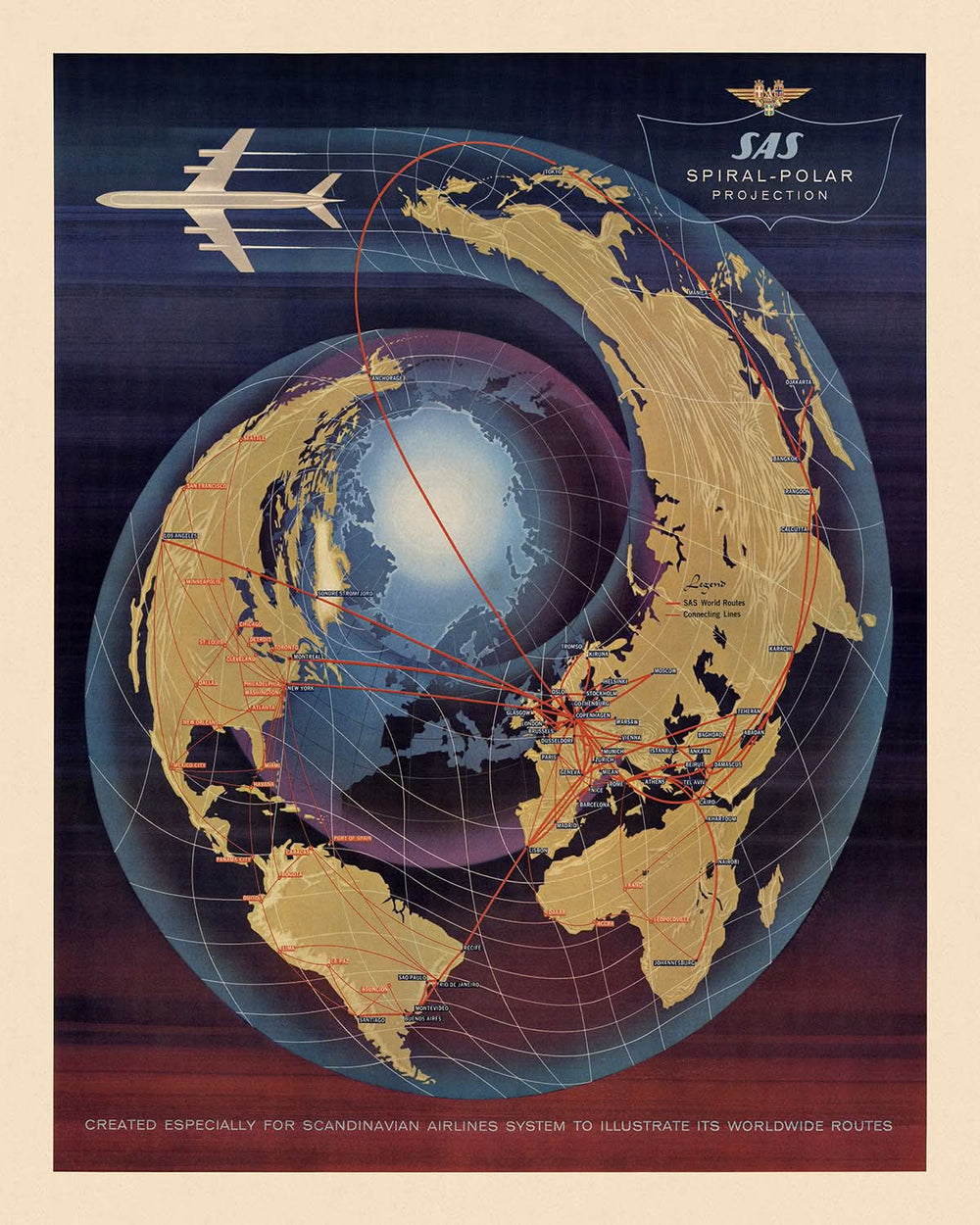 Mapa Mundi de Proyección Polar de Aerolínea Antiguo por SAS, 1960: Diseño Espiral, Rutas Globales