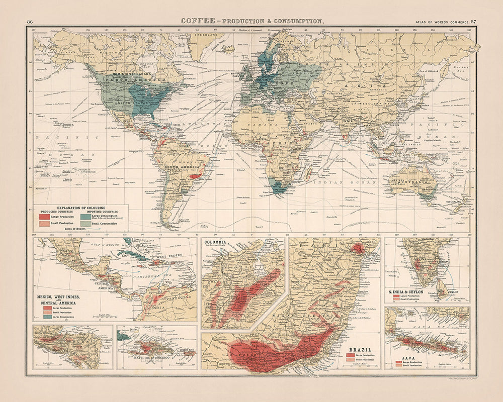 Sumérgete en el rico tapiz del comercio mundial del café con el mapa "Café - Producción y consumo", una exploración temática meticulosamente elaborada por el estimado cartógrafo escocés JG Bartholomew en 1907. Este mapa no es simplemente una representación de la tierra y el mar. ; es una narrativa vibrante del viaje del café a través de los continentes, desde las exuberantes plantaciones hasta los bulliciosos cafés del mundo. JG Bartholomew, una luminaria en el ámbito de la cartografía y la geografía, fue parte de un linaje que fundó la dinastía cartográfica Bartholomew en 1826. Sus contribuciones han dado forma significativamente a la forma en que visualizamos nuestro mundo, y sus mapas sirvieron como recursos fundamentales para el gobierno británico. , la Real Sociedad Geográfica y la Sociedad Geográfica Nacional.