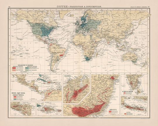 En el centro de este mapa se encuentra una descripción convincente de la dicotomía entre la producción y el consumo de café, ilustrada a través de una cautivadora paleta de rojos, naranjas, azules y verdes. Esta combinación de colores no sólo delinea las principales regiones productoras de café y a los consumidores voraces, sino que también invita a los espectadores a profundizar en los hilos socioeconómicos que conectan regiones dispares a través del comercio del café. Los recuadros detallados del mapa de América Central, Brasil, Colombia, el sur de la India y Ceilán, Java, Haití, y una vista enfocada de Honduras y Guatemala, ofrecen un examen más cercano de la intrincada red de producción de café.