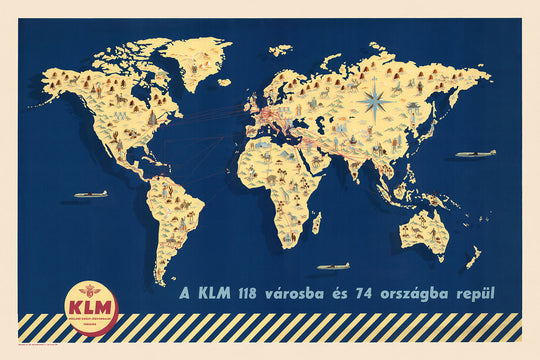 Mapa del Viejo Mundo de las Rutas Aéreas de KLM, 1955: 118 Rutas, 74 Países, Monumentos Pictóricos