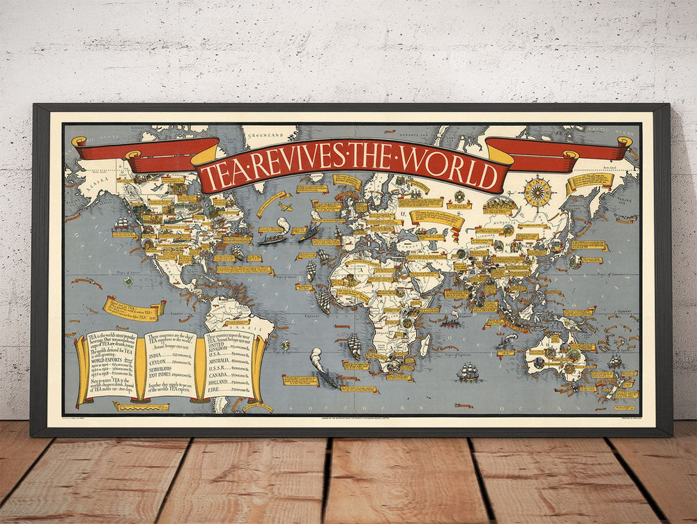 ¡Este es un hermoso y absolutamente único mapa mundial que trata... todo sobre el TÉ! Encargado por la Junta Internacional de Expansión del Mercado del Té (sí, de verdad) y elaborado por el mejor cartógrafo pictórico de la época, MacDonald Gill, este mapa de 1940 es probablemente el mayor mapa antiguo relacionado con el té que jamás encontrarás.
