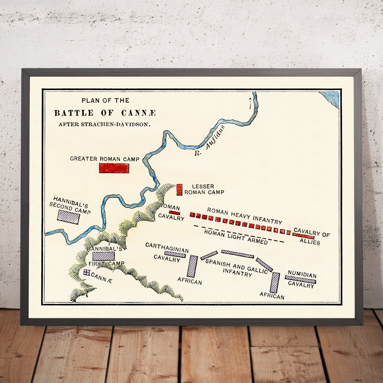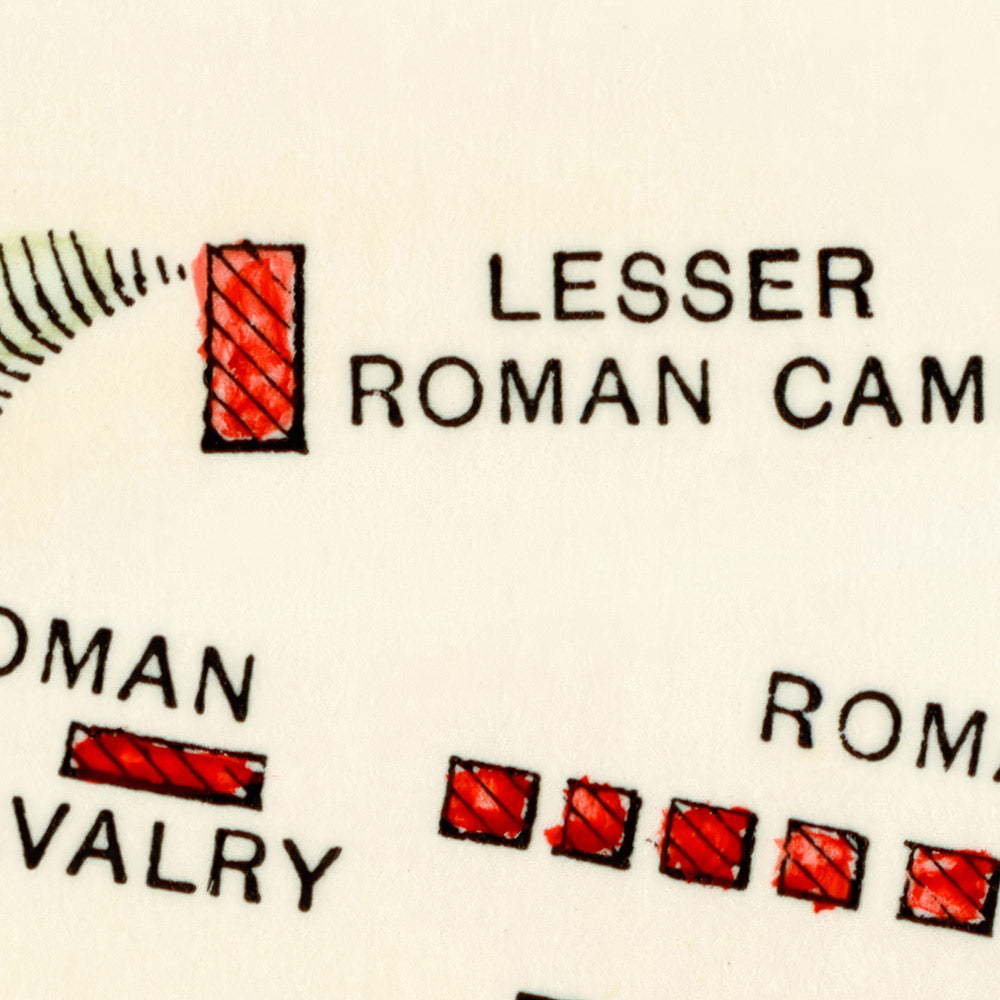 Visually, the palette is restrained and scholarly: warm beige grounds the sheet; saturated reds denote Roman arrays; purple and green distinguish opposing contingents and features of the field. Striped and solid fills differentiate troop types, while the contrast between the rigid geometry of camps and the curvilinear river adds rhythm and balance. Despite its age, the design feels modern in its clarity—a perfect blend of art and information that rewards close study and serves as an elegant focal point for a home library, office, or study.