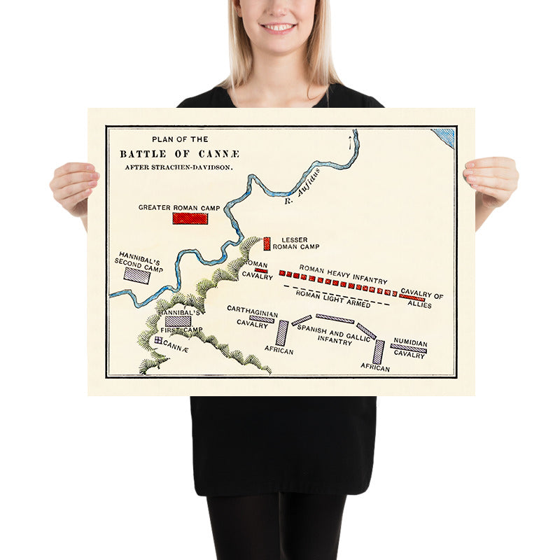 Battle of Cannae by James Strachan-Davidson is a superb 1897 antique colour lithograph that fuses cartography with historical narrative to illuminate one of antiquity’s most decisive clashes. Created for an educational history volume by the eminent classicist, this map presents the 216 BC encounter in which Hannibal defeated the Romans during the Second Punic War. With Roman troop placements clearly articulated in red and opposing forces set out in contrasting tones, the composition distills complex battlefield dynamics into an immediately legible visual account. Rectangular encampments, a winding river line, and carefully patterned unit blocks guide the eye across the terrain and make strategy visible at a glance.