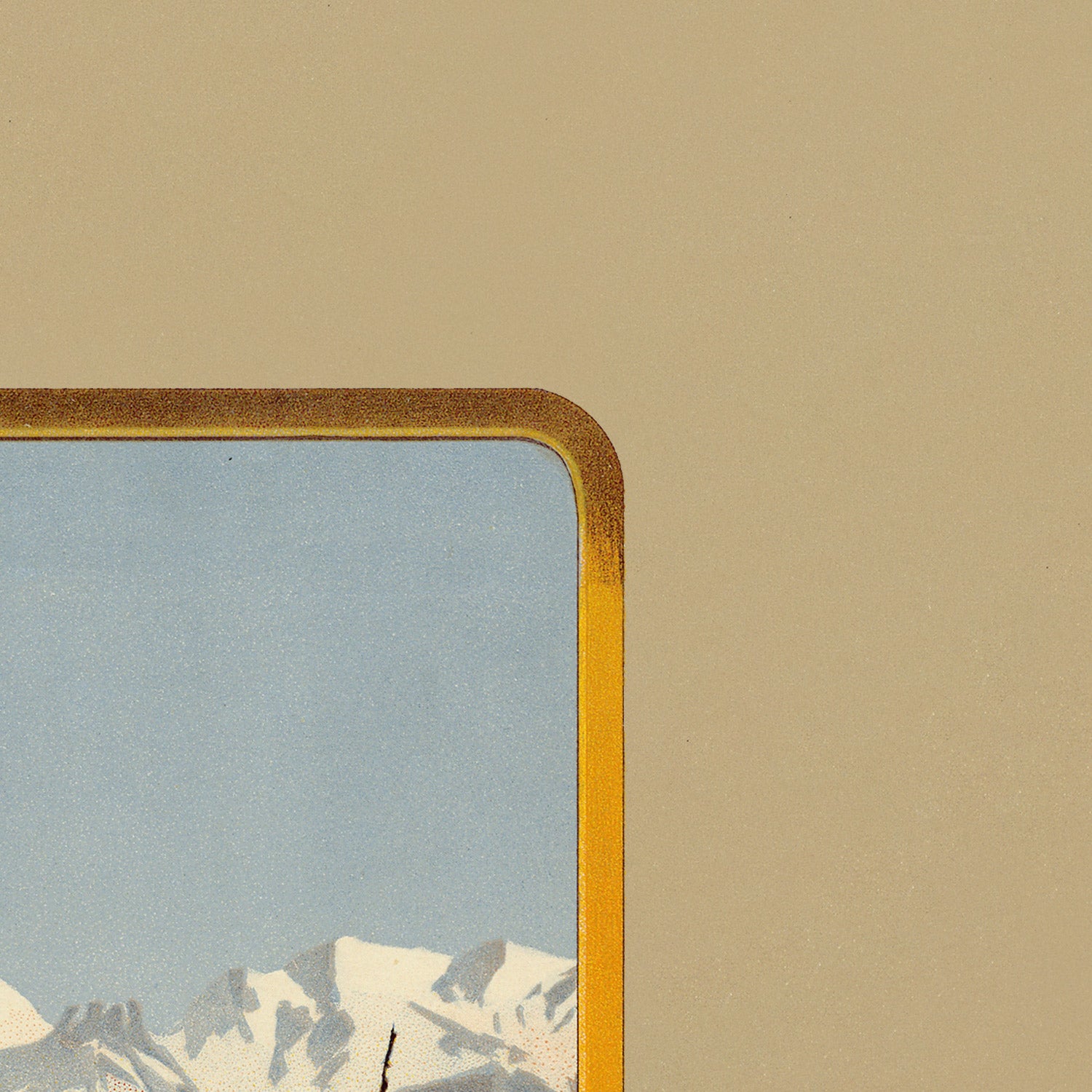 Gurten-Bahn Bern by Anton Reckziegel (1903) is a luminous slice of the golden age of Swiss travel—when a day’s excursion by funicular could promise alpine air, panoramic city views, and the romance of modern engineering. Created at the height of the Art Nouveau era, the poster celebrates the Gurten, Bern’s beloved local mountain, and the sleek Gurtenbahn that whisks visitors from the city’s edge up to meadows and outlook points over the Aare and the old town’s rooftops. With flowing ornament, heraldic details, and a rich, scenic panorama, Reckziegel makes a compelling case for Bern as both gateway to the Alps and a destination in its own right.
