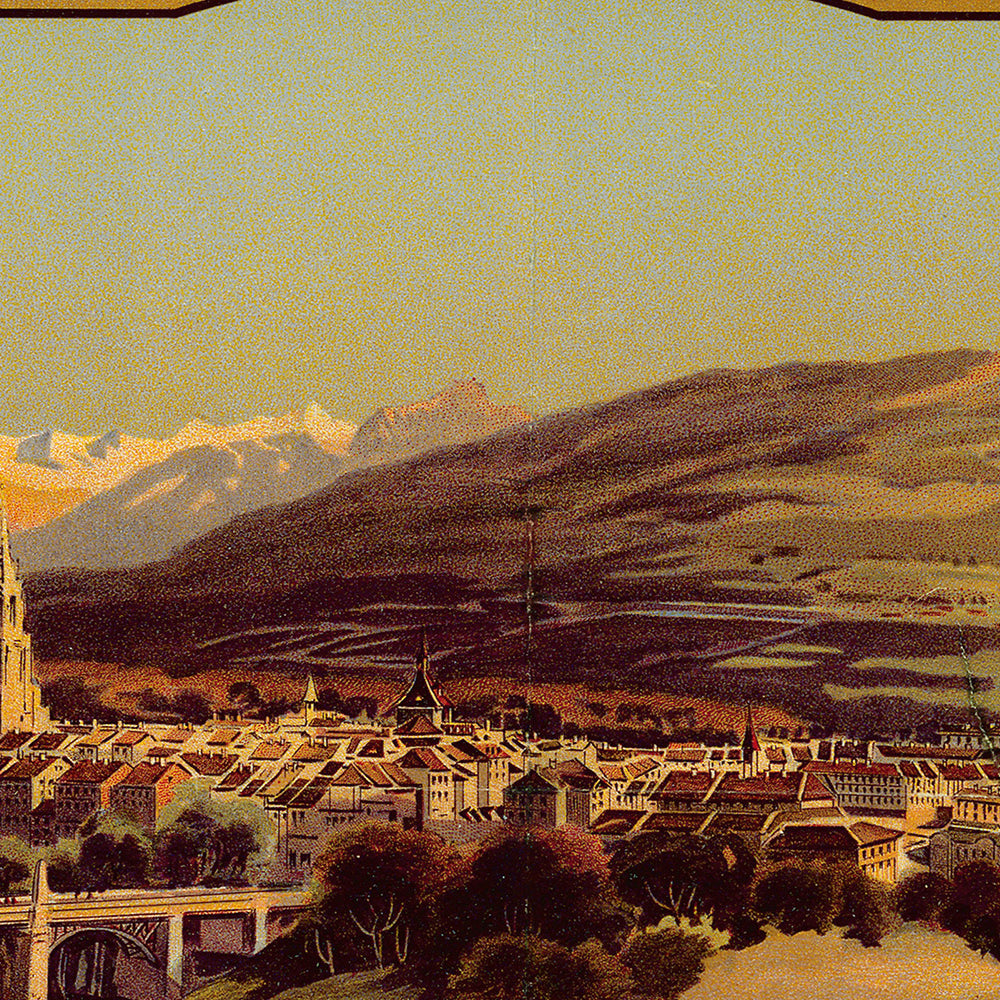 The subject itself is a perfect emblem of turn-of-the-century travel culture: the Gurtenbahn offered effortless ascent to nature from the city below, encapsulating the era’s proud union of engineering and leisure. This poster doesn’t just sell a ride; it sells a view—the sweep of Bern’s skyline, the soft silhouette of distant peaks, and the promise of fresh pastures only minutes from town. Decorative flourishes—including floral motifs and heraldic emblems—channel local pride and help prospective visitors immediately recognize both the place and its character.