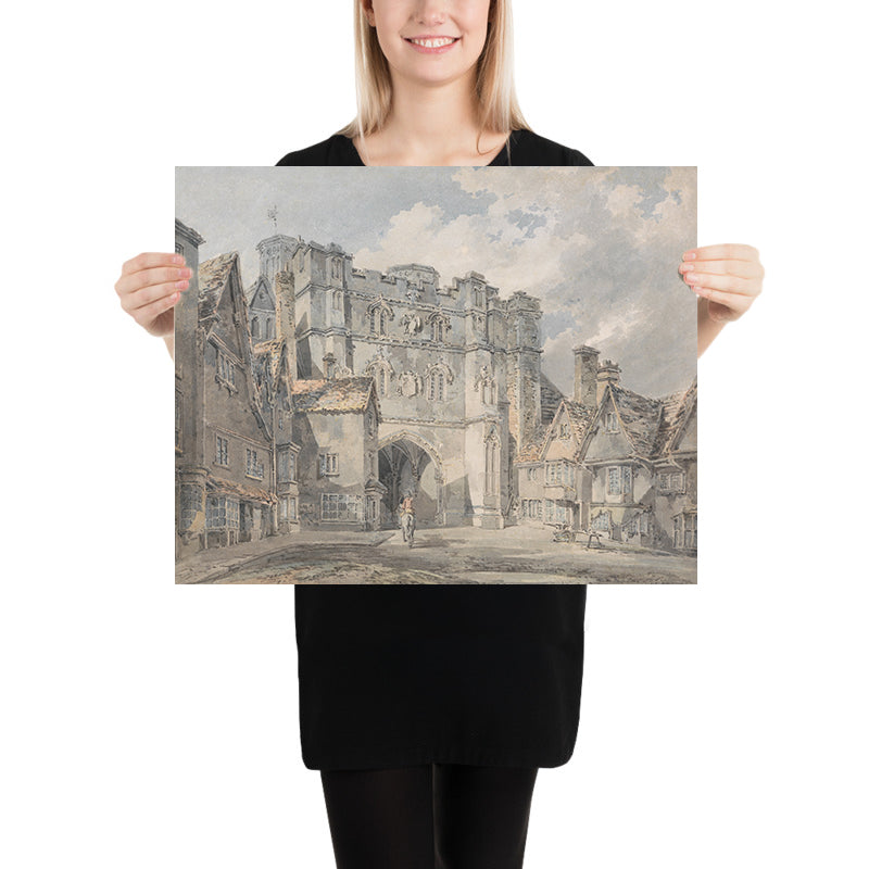 The subject itself is rich with history. Christ Church Gate stands as a Tudor-era threshold to one of Christianity’s most important English sites, long associated with pilgrimage and the legacy of Thomas Becket. In Turner’s hands, the gateway becomes more than a record of place—it’s a meditation on time and endurance, anticipating the 19th-century fascination with medieval architecture that would blossom into the Gothic Revival. The composition guides the eye through arches and rooflines, evoking the quiet hum of a city whose spiritual and civic life gathered at this point of entry.