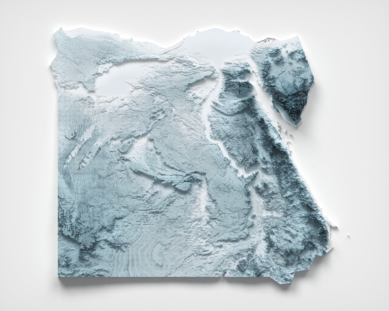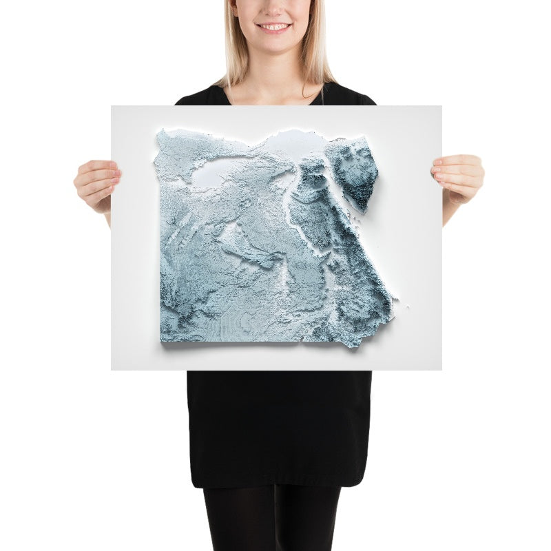 Este mapa de relieve topográfico minimalista de Egipto, elaborado por The Unique Maps Co. con nuestro característico proceso Unique 3D, prescinde de etiquetas y carreteras para dejar que la tierra hable por sí misma. Una sutil luz y sombra se deslizan por la superficie para revelar picos elevados, valles hondos, largas escarpas y amplas cuencas: un elegante retrato de la antigua geomorfología del país.