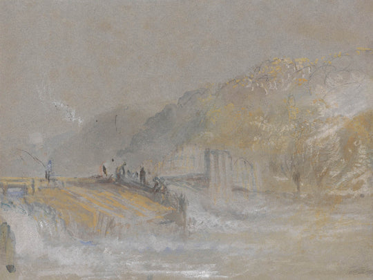 Foul by God: River Landscape with Anglers Fishing From a Weir es una pintura magistral completada en 1830 por el célebre artista paisajista inglés Turner. Reconocido por su tratamiento expresivo y atmosférico de la luz y la naturaleza, Turner captura aquí una tranquila escena de un río inglés donde los pescadores lanzan sus líneas mientras están al lado de un viejo dique, representada en su estilo inconfundible impregnado de emoción y drama. Esta obra es emblemática de la profunda apreciación de Turner por el mundo natural y su capacidad para evocar estados de ánimo enteros a través de su única manipulación del tono y la forma.