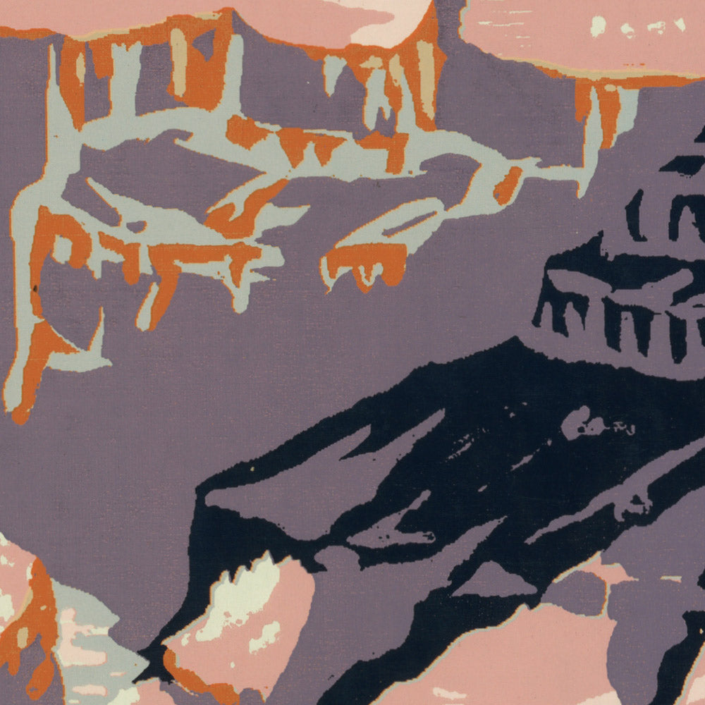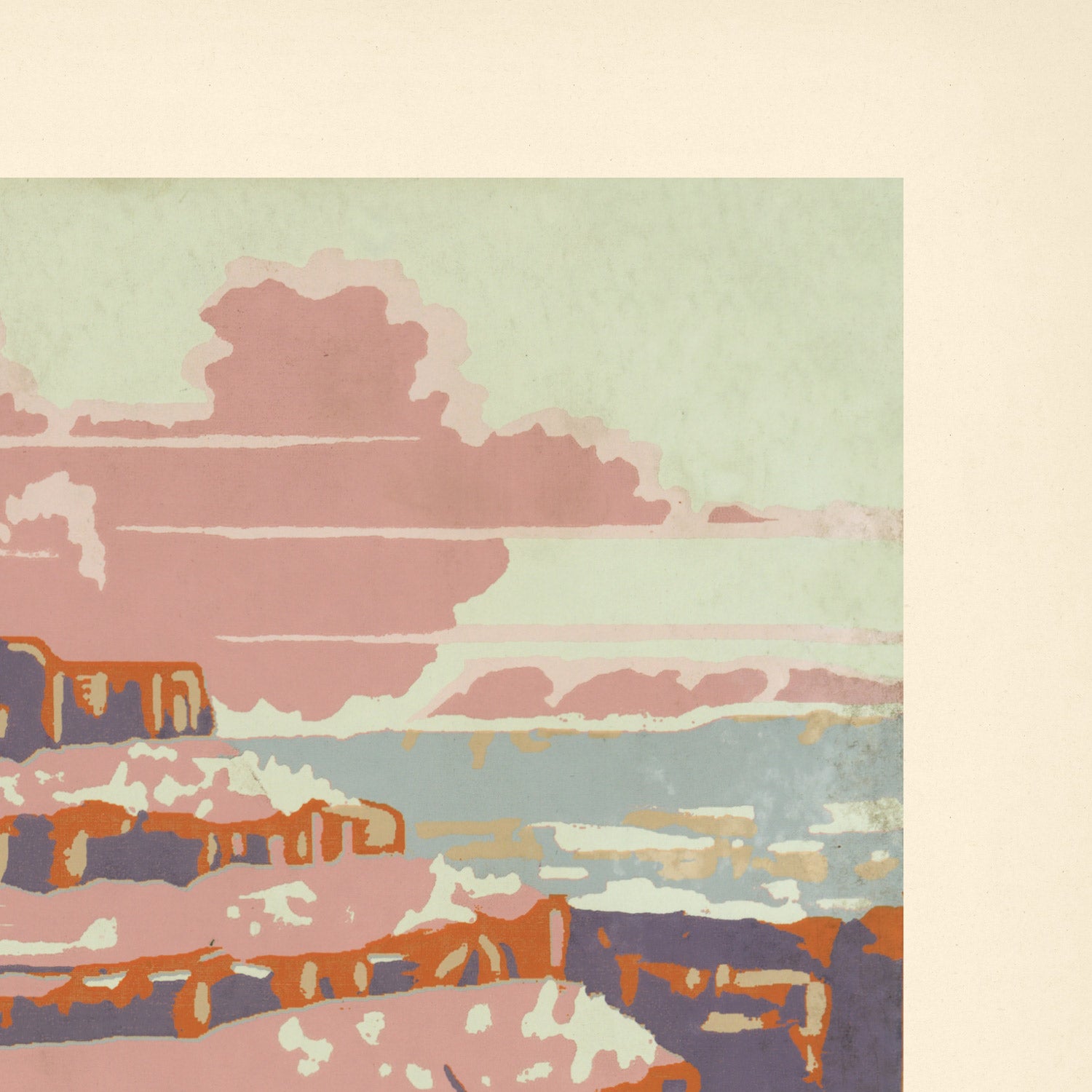 Design you’ll love living with: Dominated by pink and purple canyon walls softened by beige strata, the palette glows with twilight warmth, while muted blues cool the distant horizon. Flat, poster-like fields of color, minimal linework, and simplified, stair-stepped rock formations channel Art Deco refinement. Depth is conveyed not by intricate detail but by overlapping shapes and restrained shading—an elegant, modern solution that reads beautifully from across the room.