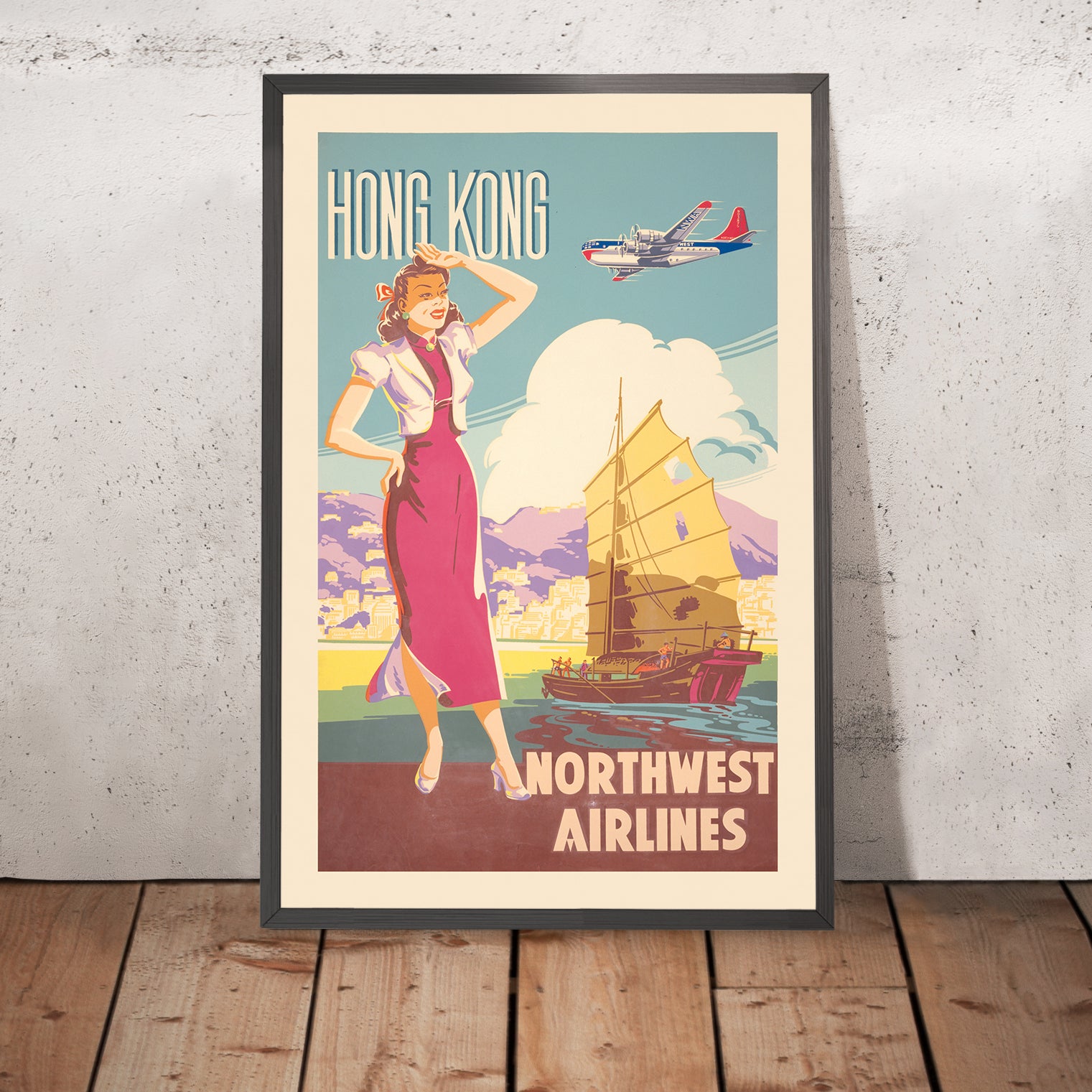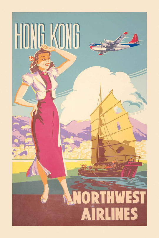 Hong Kong – Northwest Airlines (1950) invites you into the glittering theatre of Victoria Harbour at the dawn of the jet age. Created by an anonymous commercial illustrator working in the golden era of mid‑century travel advertising, this vivid poster balances romance and modernity: a traditional Chinese junk glides across calm blue-green waters while a sleek airliner arcs above the skyline. A fashionable traveler in the foreground anchors the scene, her elegant silhouette and pose capturing the promise of effortless adventure. Rendered in optimistic pastels—petal pinks, sky blues, and sunny yellows—the composition distills the excitement of discovering Hong Kong’s bustling streets, neon nights, and storied waterfront in a single, memorable frame.