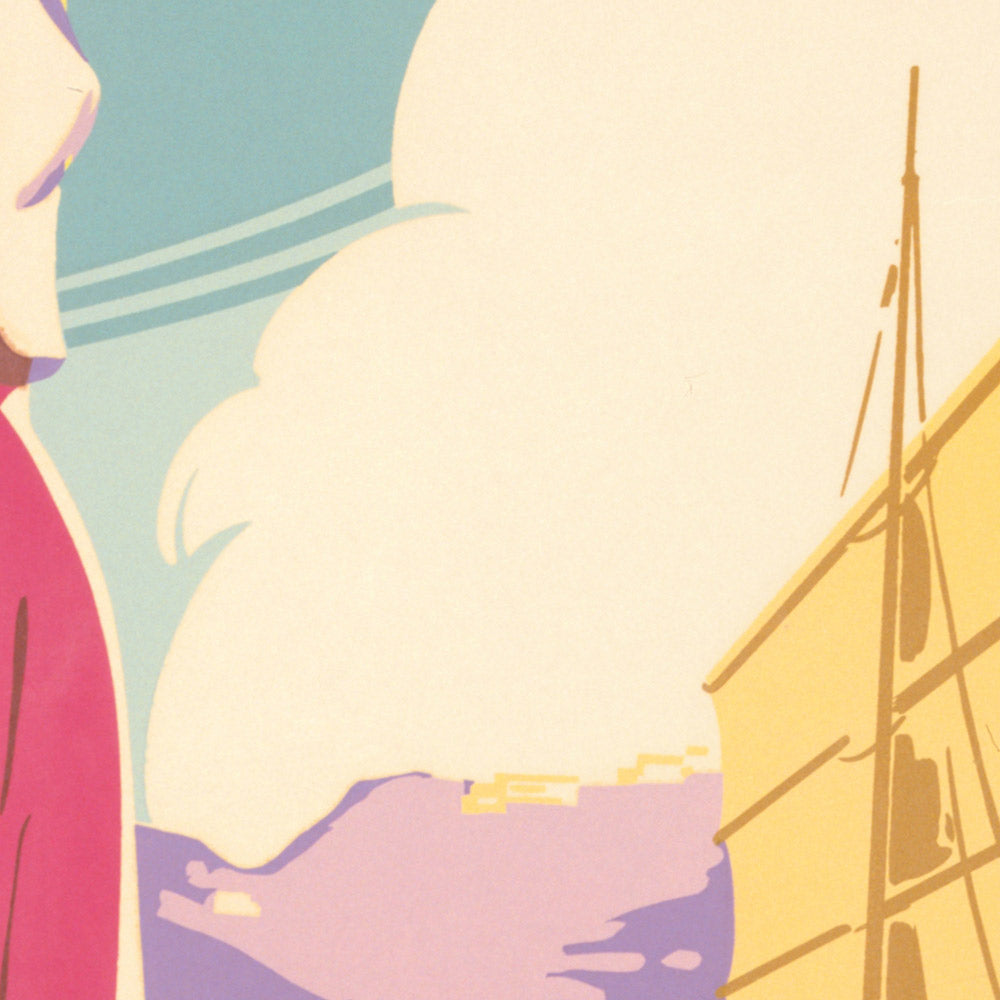 Design and color you’ll love: The artist’s palette of pinks, blues, and yellows radiates warmth and welcome, while soft gradients and carefully layered forms create depth without clutter. Flowing organic shapes—the curve of the dress, the sails, the harbor—converse with the geometric rhythm of buildings, a hallmark of modernist poster design. The result is both decorative and narrative: a statement piece that pairs beautifully with mid-century furniture, contemporary minimalism, or coastal interiors, and one that instantly brightens an entryway, study, or living room.