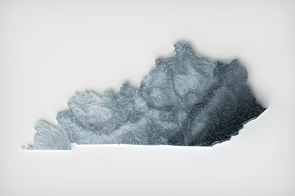 Da vida al Estado de Bluegrass con este mapa intrincadamente detallado de Kentucky, Estados Unidos. Desde las colinas onduladas de la región central de Bluegrass hasta las dramáticas crestas y profundos valles del Plateau Apalache en el este, cada curva y contorno de la tierra está bellamente representado. Observa cómo la interacción de luz y sombra acentúa los picos escarpados y los valles serpenteantes de las Montañas Cumberland, mientras que las suaves ondulaciones del Plateau Pennyroyal y los Campos de Carbón del Oeste se extienden con gracia a través de la mitad occidental del estado.